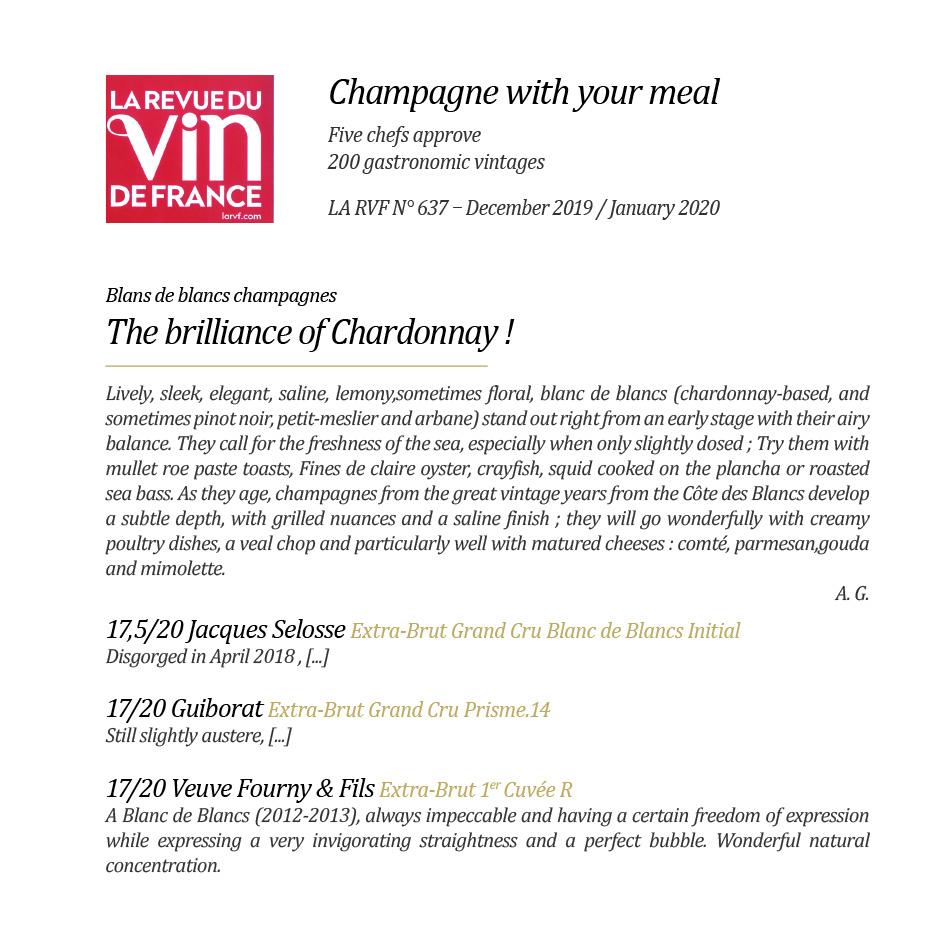 Lively, sleek, elegant, saline, lemony,sometimes floral, blanc de blancs (chardonnay-based, and sometimes pinot noir, petit-meslier and arbane) stand outright from an early stage with their airy balance. They call for the freshness of the sea, especially when only slightly dosed; Sly them with mullet roe paste toasts, Fines de claire oyster, crayfish, squid cooked on the plancha or roasted sea bass As they age, champagnes from the great vintage years from the Cote des Blancs develop a subtle depth, with grilled nuances and a saline finish; they will go wonderfully with creamy poultry dishes, a veal chop and particularly well with matured cheeses comte, parmesan, gouda and mimolette.