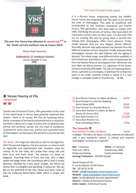 Charles and Emmanuel Fourny, fifth generation at the head of this small house in Vertus, have perfectly mastered their subject. There is, of course, the Clos du Faubourg Notre Dame, monopoly of the family and pampered as it should be, but there is above all a range of wines with ethereal style, precise and perfectly carved. For this level of excellence, sustained for some years now, and for such a graceful vision of CHampagne, we have given the domaine a second star this year.